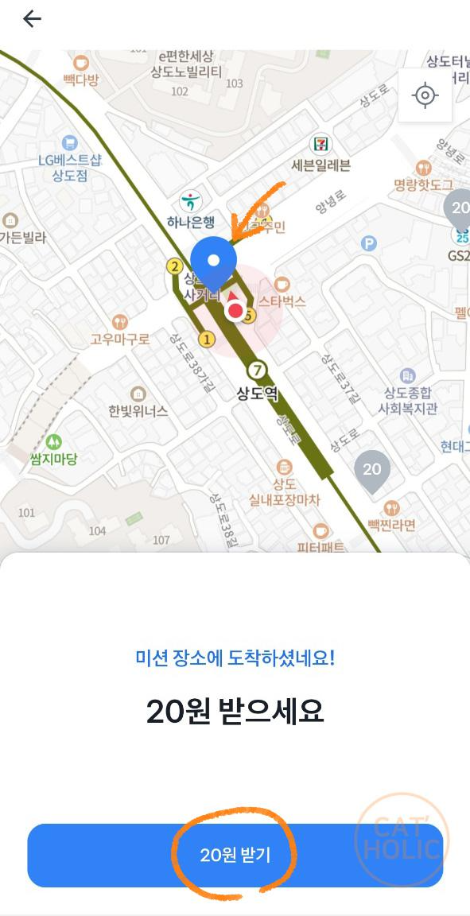 4) 도착하면 바로 팝업이 뜨고 [20원 받기]를 누르면 적립된다.