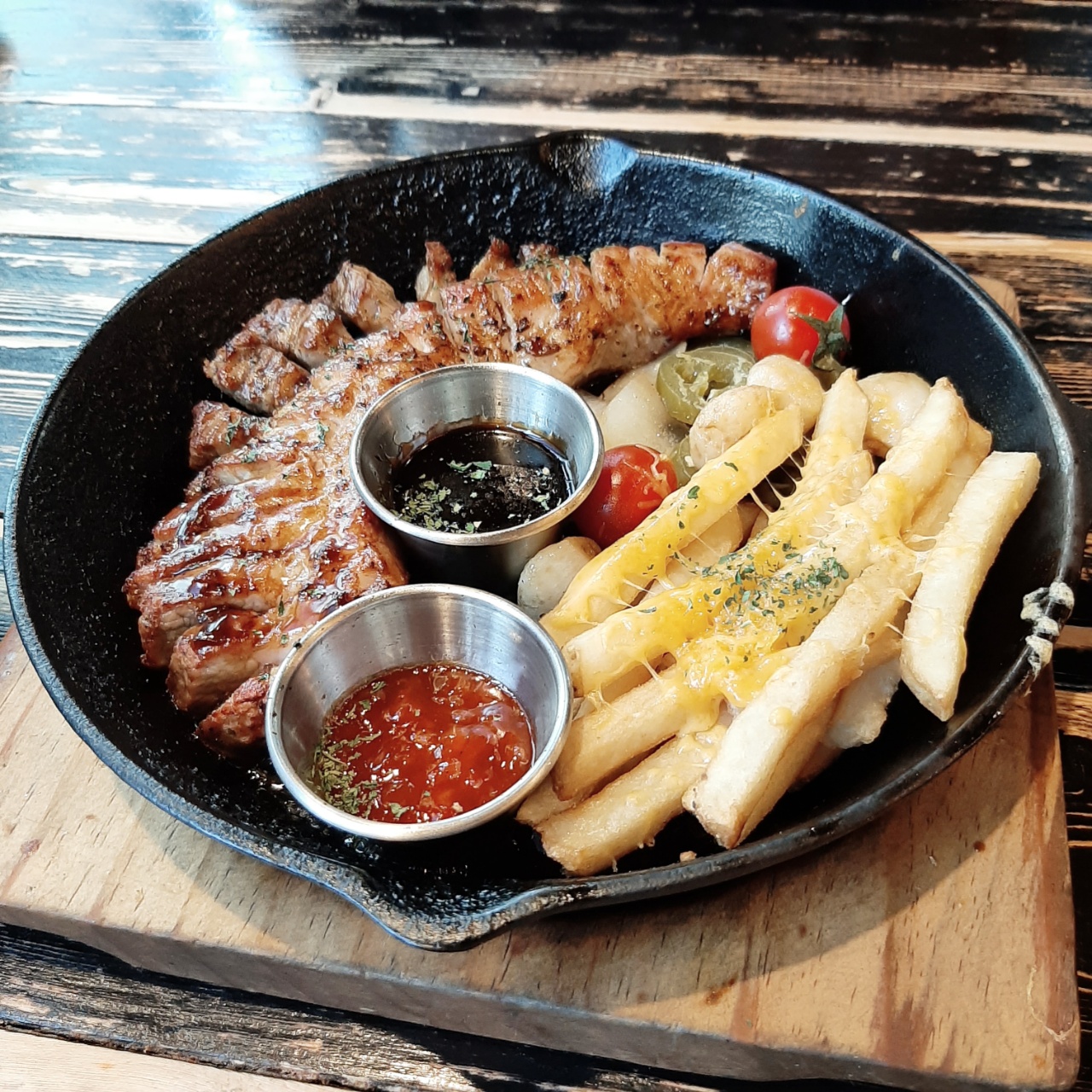감자튀김, 웨지감자, 방울토마토, 스테이크, 할라피뇨가 한 팬에 플레이팅.