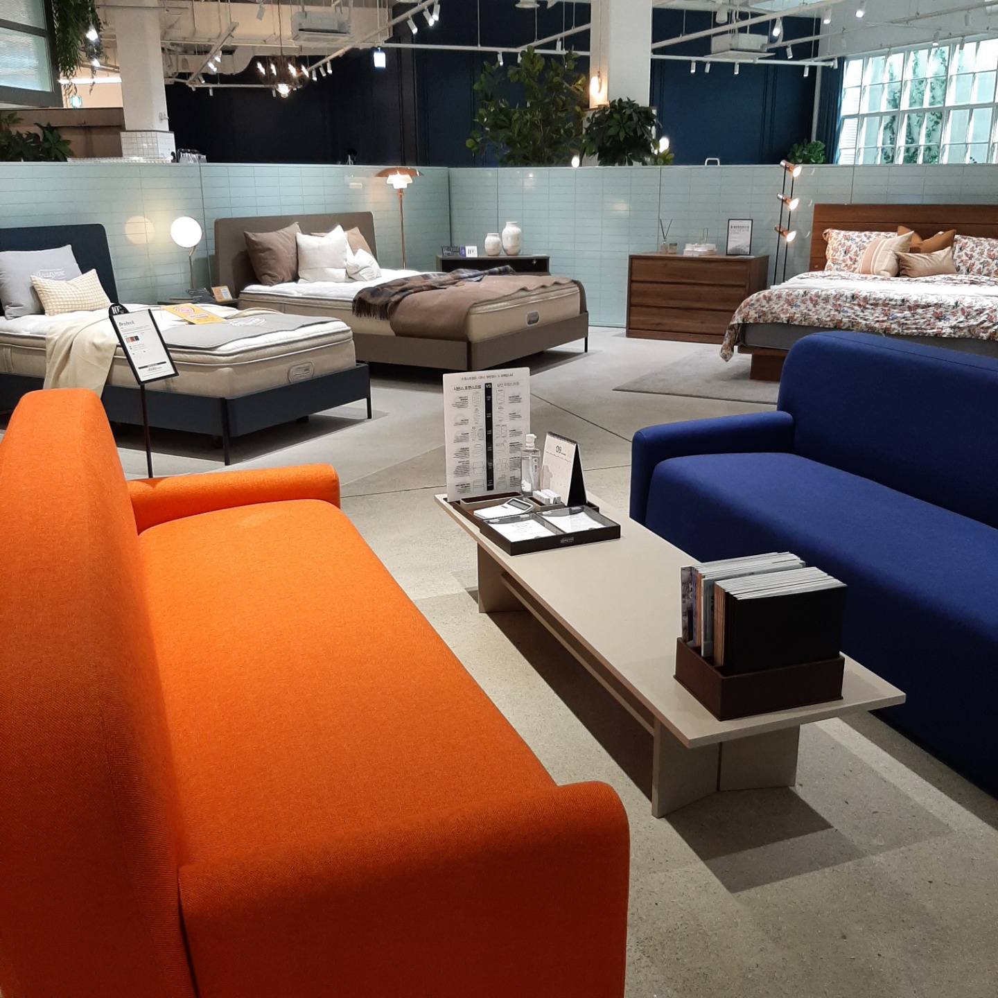 다양한 사이즈의 매트리스와 프레임, 색색의 침구를 보니