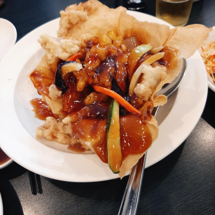 특이하게 얇은 튀김피 위에 탕수육이 담아져 있었다.